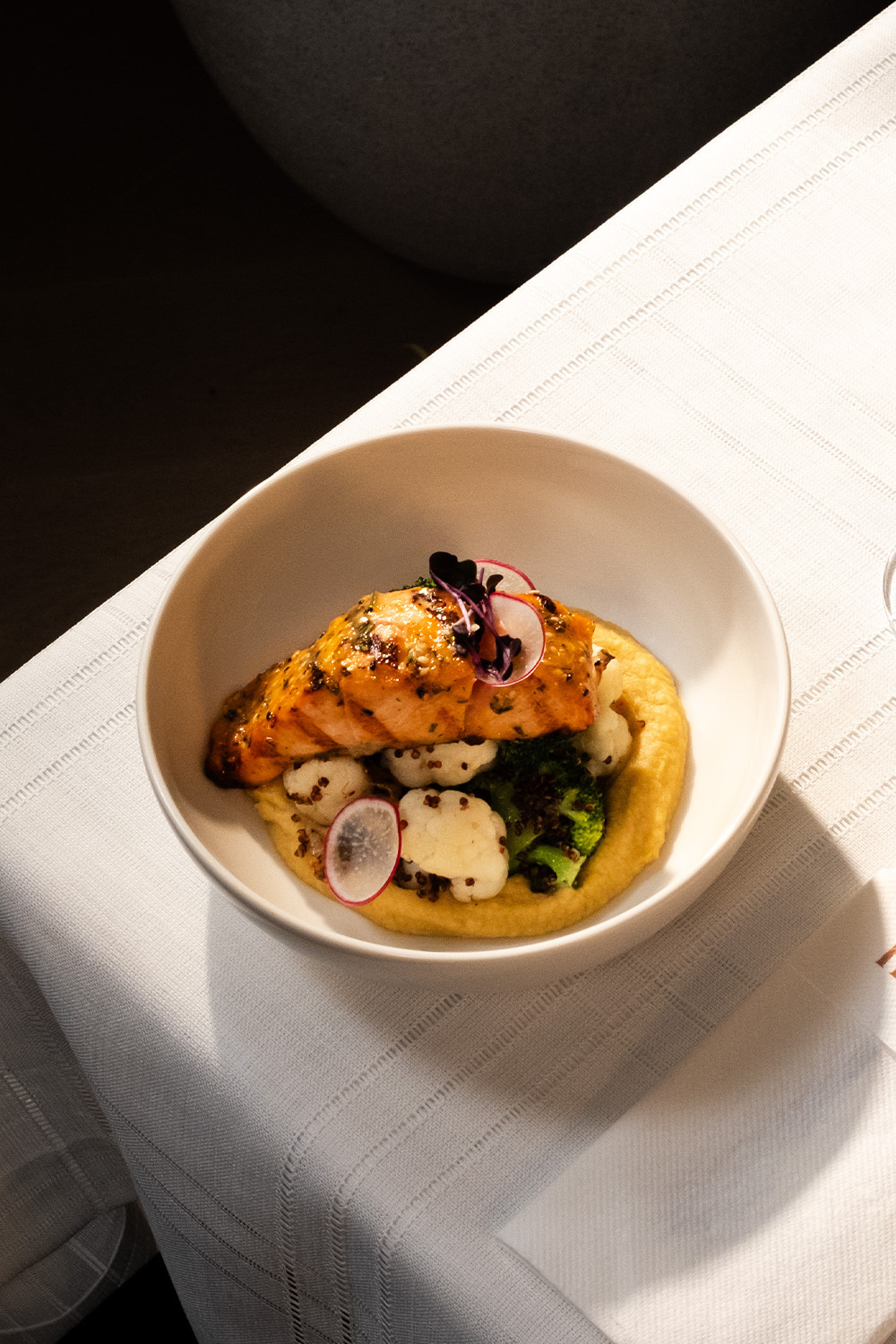 Somon füme, krem peynir, hardal, kapari çiçeği, dereotu, pate choux, maskolin, pancar, portakal, hardal sosu, zeytin yağı, kinoa